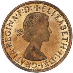 ELIZABETH II, Perth Mint proof penny, 1956. Toned highlights, somewhat dulled, otherwise nearly FDC and ...