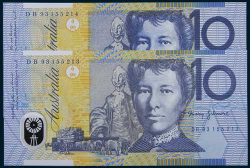 TEN DOLLARS, Fraser/Evans (1993) DB 93 155213/4 consecutive pair but unusually, the first with grey Dobell shading and the second with blue Dobell shading (R.316a, 316i). Uncirculated. (2)