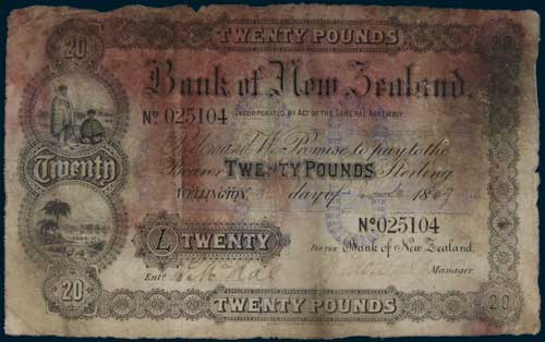 THIRD ISSUE, twenty pounds, Wellington, 1st July 1907 (over printed 18-), No. 025104 (Robb.D.361a; L.448; P.S194). Well worn, with many folds and splits in paper, extensive staining in top half having been subjected to water, otherwise very good and excessively rare, only one known of this variety in private hands with hand written date and signature.