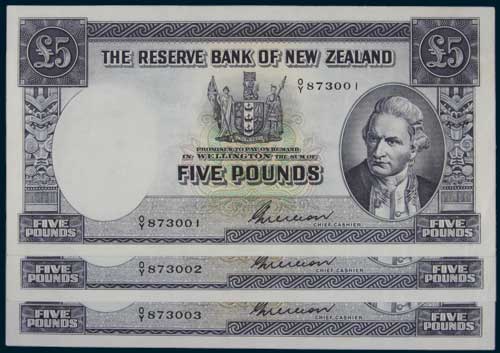 G. WILSON (1955-56), five pounds, number over letter, 0/Y 873001/3, three consecutive notes (Robb.R.242; L.622; P.160b). Nearly uncirculated. (3)