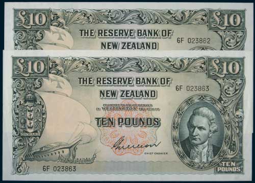G. WILSON (1955-56), ten pounds, number letter, 6F 023862/3, consecutive pair (Robb.R.253; L.625; P.161b). Nearly uncirculated. (2)