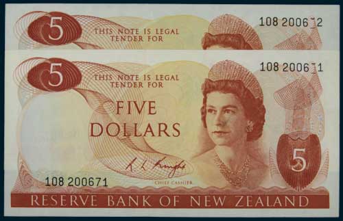 R.L. KNIGHT (1975-77), five dollars, three numbers, 108 200671/2 consecutive pair, slipped fifth digit '7' on both top serial numbers (Robb.R.334; L.660; P.165c). Virtually uncirculated. (2)