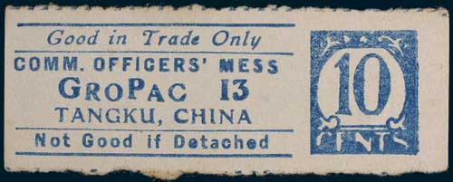 CHINA, Tangku (or Taku), c.1945, Comm. Officers' Mess, GroPac 13, chits for five cents (board) and ten cents (thick paper). Some foxing otherwise good very fine and rare. (2)