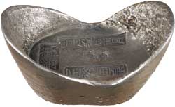 CHINA, Ch'ing Dynasty (1644-1911), silver boat shaped sycee ingot, similar to type Shandong Province pure silver ingot, twelve taels or twelve ounce type (435gms) with three blocks of Chinese characters as stamps (cf. Cribb 152 [Pl.36] for similar size and type). Very fine and rare.