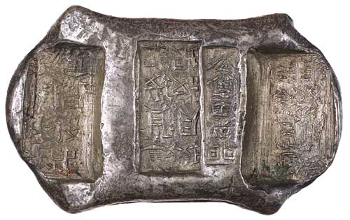 CHINA, Yunnan Province, silver five stamped remittance ingot as a five taels sycee ingot or saddle pack of five blocks of stamps, c.1910 (185 grams), (cf.Cribb 751). Good very fine.