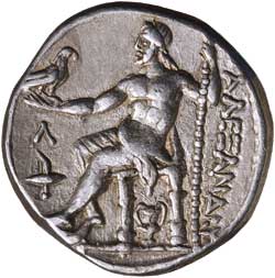 MACEDON, Kingdom of, Alexander III, (336-323 B.C.), silver tetradrachm, (17.13 grams), Macedonian mint probably Amphipolis, issued under Kassander, c.310 - 294 B..C., obv. head of Herakles to right wearing lion skin with dotted border, rev. Zeus Aetophoros seated on throne to left, eagle in outstretched hand, **L* over torch, kantharos below throne, to right **ALEXANDROU*, (cf.S.6713, Price 468, (p.136, Pl.XXX), BMC 468a-c, M.60, SNG Cop. 697). Nearly extremely fine and very scarce.