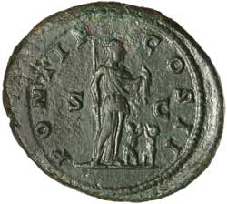 GETA, (A.D.209-212), issued as Caesar 2090, AE as or dupondius, Rome mint, (11.988 grams), obv. P SEPTIMIVS GETA CAES, bust bare headed, draped to right, rev. around PONTIF COS II, woman standing to right, holding sceptre and drawing out drapery from breast, to right two small figures lifting hands to one another, (cf.S.7282, RIC 150a, C.113). Dark green patination, nearly extremely fine and very rare, comes with collectors card description.
