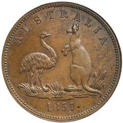 FISHER, Melbourne halfpenny, 1857 (A.122). Brown with some mint red, uncirculated/choice uncirculated and rare in this condition.