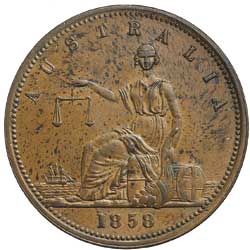 MORGAN, William, Adelaide penny; 1858 (A.386). Attractive light red brown patina, extremely fine and rare in this condition.