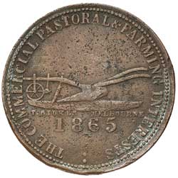LOVE & ROBERTS, Wagga Wagga penny, 1865 (A.335). Pitted flan otherwise nearly very fine and rare.