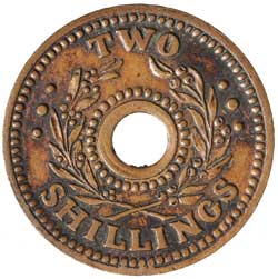 COMMONWEALTH OF AUSTRALIA, World War II Internment Camps, two shillings. Glossy brown, nearly extremely fine. ...
