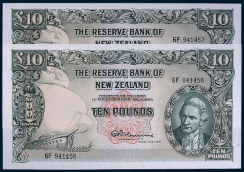 RESERVE BANK, R.N. Fleming (1956-67), ten pounds, without security thread, number letter, 6F 941456/7, consecutive ...