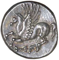 SICILY, Syracuse, (317-289 B.C.), silver stater, (6.73 grams), obv. head of Athena to right wearing plain Corinthian helmet, upright trident in left field, rev. Pegasos flying to left, thunderbolt below, (cf.S.976; Calciati 24, SNG Ash.2093). Dark tone, extremely fine and rare.