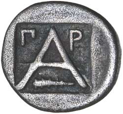 PELOPONNESOS, Argolis, Argos, silver obol, 320's - 270's B.C., (0.80 grams), obv. wolf head to left, above **S* reversed, rev. A in shallow incuse square, across **P R*, below club to left, (cf.S.2796, BCD 1090 (p.269, LHS 96), Traite -, BMC 94, Mycenae Pl.10, 36, SNG Cop. 54, SNG Fitz. 3810-1). Nearly very fine and very scarce.