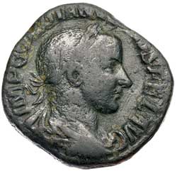 GORDIAN III, (A.D. 238-244), AE sestertius, (21.03 grams), issued 242-243, Rome mint, obv. laureate bust to right of Gordian III, draped and cuirassed, around IMP GORDIANVS PIVS FEL AVG, rev. Gordian standing to right, holding transverse spear and globe, around P M TR P V COS II P P, S C across, (cf.S.8731, RIC 307a, C.267). Rectangular flan, dark brown patination, very fine/nearly very fine, scarce.
