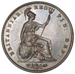 QUEEN VICTORIA, young head, copper penny, 1857, ornamental trident (S.3948; Peck 1513). Good extremely fine. ...