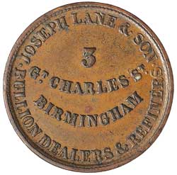 LANE, Joseph & Son, Birmingham penny, undated (A.673). Thin flan, medium brown, good very fine and scarce.