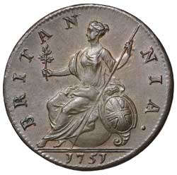 GEORGE II, old head, copper halfpenny, 1751 (S.3719). Traces of original mint red on obverse, flawed R in Rex, good extremely fine.