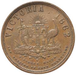 BARROWCLOUGH, Melbourne penny, 1862 (A.28). Upset die axis 180 degrees, thin flan, rim nick on obverse at 11 o'clock, otherwise good very fine and scarce.
