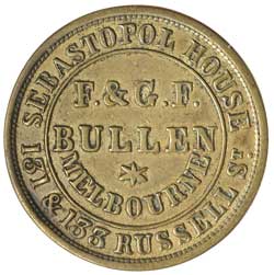 BULLEN, F. & G.F., Melbourne check piece, in brass (24mm), undated (R.62). Good very fine and scarce.