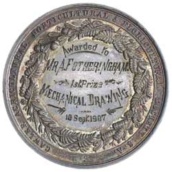 GAWLER AGRICULTURAL HORTICULTURAL & FLORICULTURAL SOCIETY S.A., undated (1907), in silver (47mm) by Stokes & Martin.Melbourne, inscribed on reverse, 'Awarded to/Mr A.Fotheringham./1st Prize/Mechanical Drawing./18 Sept.1907'. Extremely fine.