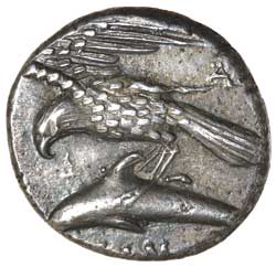PAPHLAGONIA, Sinope, (330-300 B.C.), silver drachm, (6.01 gm), obv. head of nymph to left wearing earring and [necklace], dotted border, rev. sea-eagle grasping dolphin with talons all to left, magistrate A[**G*PE] above eagle wing, **SIN[W]* below, (cf.S.3696; SNG BMC 1481 [same dies], SNG Von Aulock 201). Toned, off centred obverse, good very fine and scarce.