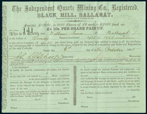 VICTORIA MINING. Garibaldi Gold, Kidd's Gully, Daylesford, 186[5], one £22 10s share of 192 on ...
