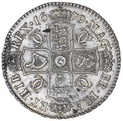 CHARLES II, halfcrown, fourth bust, 1679 decns error for decvs (S.3367; ESC.483). Cleaned, carbon flecking on obverse, adjustment marks at French arms shield, otherwise good very fine and rare.