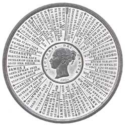 CHRONOLOGY OF THE REIGNS OF ENGLAND, in white metal, undated (c1840) by Thomas Ottley, obverse, inscriptions radiating from a circular centrepiece containing the head of a young Queen Victoria, reverse, inscriptions radiating from a circular centrepiece bearing the title of the medal. Most mint bloom, virtually uncirculated.
