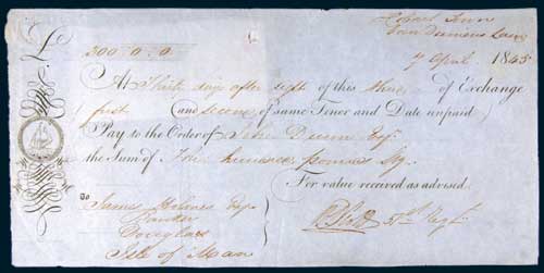 SIGHT NOTE, for three hundred pounds from a member of the 51st Regiment, James Holmes Esquire, Banker, Douglas, Isle of Man, to John Dunn Esquire, Hobart Town, Van Diemens Land, 7 April 1845, with a small note handwritten on a separate piece of paper showing a discount. Some pinholes, small hole centre top of note, very fine.