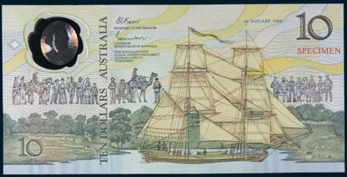 TEN DOLLARS, Johnston/Fraser (1988), specimen polymer commemorative issue, AA 00 000 000, specimen No 0065 ...