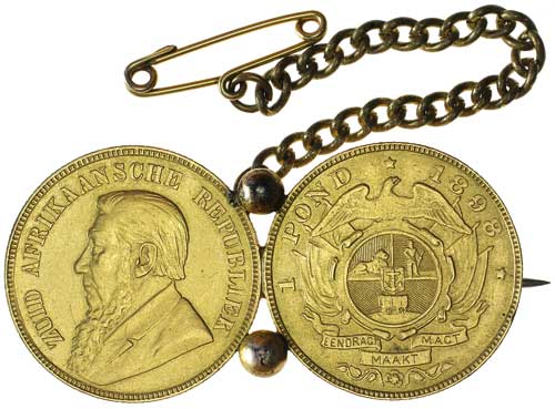 SOUTH AFRICA, ZAR, gold ponds, 1898 (2) as coin brooch, with safety chain. Very fine.
