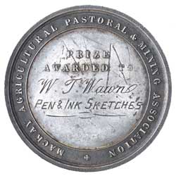 MACKAY AGRICULTURAL PASTORAL & MINING ASSOCIATION, undated, in silver (38mm) by T.S. (Thomas Stokes), on reverse, Prize/Awarded To, below inscribed 'W.T.Wawn/Pen & Ink Sketches'. Graffiti in obverse and reverse fields, otherwise extremely fine and rare.