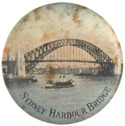 SYDNEY HARBOUR BRIDGE, commemorative, souvenir and club badges and tinnies, many enamelled issues, also a D.M.R. Toll Supervisor S.H.Bridge badge, Bridge cufflinks and a tinnie Souvenir of Australia 150th Anniversary 1938, oval with panoramic view of the Bridge from Blues Point area on North side, also noticed a contemporary oval tinnie-style ladies purse-size mirror with Bridge image on one side. A huge variety stored in a coin album, mostly very fine - uncirculated. (104)