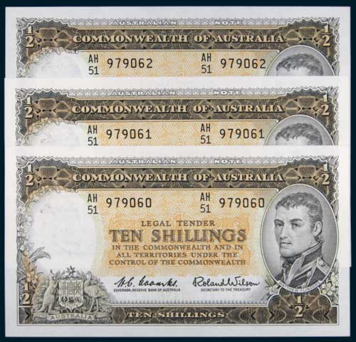 TEN SHILLINGS, Coombs/Wilson (1961) AH/51 979060/62 (R.17) consecutive run of three notes. Uncirculated. (3)