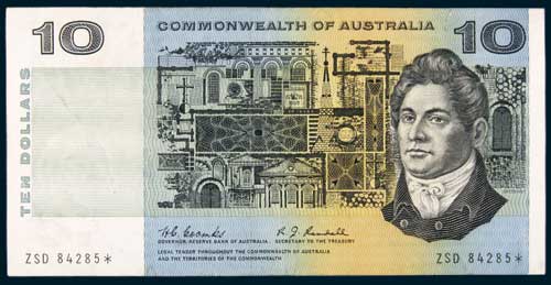 TEN DOLLARS, Coombs/Randall (1967) ZSD 84285* (R.302sF) first prefix star note. Flattened, extremely fine and ...