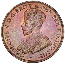GEORGE V, 1928, London die. Peripheral obverse die breaks, subdued full mint red, choice uncirculated ...