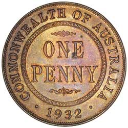 GEORGE V, 1932, London die. Brown and red, nearly ucirculated/uncirculated.