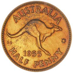 ELIZABETH II, Perth Mint proof halfpenny, 1955. Rich brilliant mint red, touch of toning above kangaroo, otherwise FDC and rare.