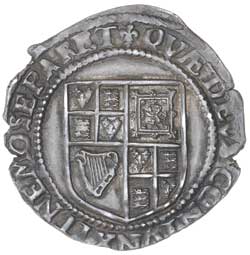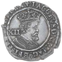 JAMES I, (1603-1625), third coinage, 1619-25, silver shilling, mm lis, 1623-4 (S.2668) (5.91g). Uneven edge, slightly off-centre, dark grey tone, choice portrait, nearly extremely fine.