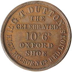TRADE OR ADVERTISING TICKETS, by W.J.Taylor or related, all in copper (28mm); E.Parker Importer of Wines and Spirits etc, reverse Wine Vaults and Chichester Cathedral behind, dated 1831; Taylor's mule, the previous reverse with the obverse of the Dutton ticket following, Victoria 5th October 1857 around young head left, WJT on truncation reverse the 1831 crypt of Cathedral scene; the same obverse with G.T. DUTTON, the celebrated 10s 6d Oxford Shoe etc (2) (see H.pp753-756.). Very fine - nearly uncirculated the second very rare. (4)