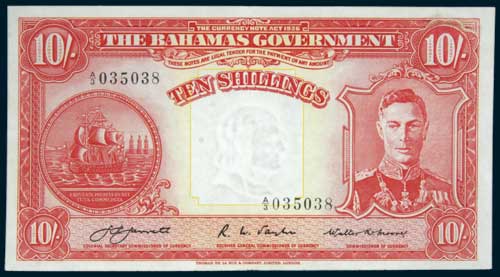 BAHAMAS, The Bahamas Government, George VI, ten shillings, undated (1936), A/3 035038 (P.10a). Flattened of folds, extremely fine and rare.
