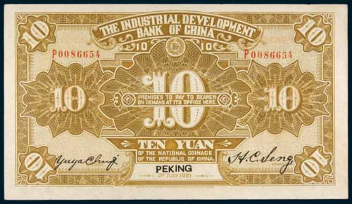 CHINA, Republic, The Industrial Development Bank of China, Peking 1st July 1921, ten yuan P0086654 ...