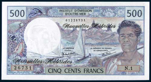 NEW HEBRIDES, Institut D'Emission D'Outre-Mer, Nouvelles Hebrides, five hundred francs, undated, N.1 01226731/5, a run ...