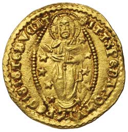 ITALY, Venice, Pasquale Malipiero (1457-1462), ducat or zecchino, (3.54g), obv. S.M.VENETI PA MARIPET, Doge kneeling before St. Mark, DVX in field, rev. Christ standing within stars, around .SIT.T.XPE.DAT.QTV REGIS.ISTE.DUCAT, (Friedberg 1233, Paolucci p.42, Biaggi 2887). Nearly extremely fine.