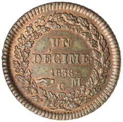 MONACO, Honore V, copper decime 1837C M (KM.95.1). Brown and red patination, about as struck, extremely fine and scarce.