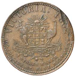 COPE, Thos.H., South Yarra penny, 1862 (A.81). Planchet flaw, otherwise medium brown patina, good very fine.