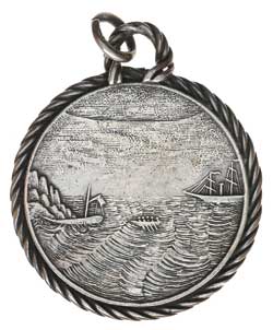BARQUE AGNES RESCUE MEDAL, 1876, in silver (36mm), obverse, a boat being rowed from a steam vessel at right towards a wreck on a rocky shore at left, reverse inscription in high relief, 'PRESENTED TO/ R.GRIFFITHS (this name engraved)/ ONE OF THE CREW OF THE/MACDONNEL BAY LIFEBOAT/IN APPRECIATION OF HIS/SERVICES IN RESCUING/THE CREW OF THE BARQUE/ AGNES,/ON 19TH JULY,/ 1876.', with a rope border and rope loop. Very fine and scarce.
