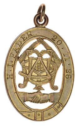 UNITED COMMERCIAL TRAVELLERS ASSN. of Australia, fob badge (29x21mm plus suspension ring), in 9ct gold (6g), voided design (reverse inscribed, 'H.I. Fader/20.11.26'. Good very fine.