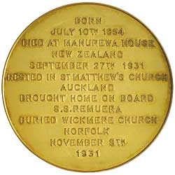MEMORIAL TO ROBERT WALPOLE, 1931, in gold (9ct, 54.6g, 47.5mm), obverse, In Memory of Robert Horace Walpole, 5th Earl of Orford - Fariquae Sentiat, on reverse, Born / July 10th 1854 / Died at Manurewa House / New Zealand / September 27th 1931 / Rested in St Matthew's Church / Auckland / Brought Home on Board / S.S.Remuera / Buried Wickmere Church / Norfolk / November 8th / 1931. Uncirculated.